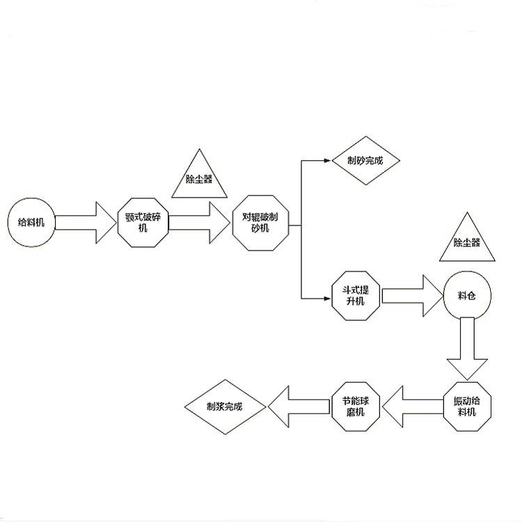針對李總的煤矸石原料大?。?00mm),以及時產(chǎn)量的要求(100T),我們?yōu)槠湓O(shè)計了煤矸石制砂方案,需要使用到的設(shè)備有給料機、顎式破碎機、對輥制砂機等。另外李總還提到在煤矸石制砂完成后想進(jìn)一步將其制作成漿,需要使用到的后續(xù)設(shè)備有斗式提升機、料倉、振動給料機、節(jié)能球磨機等。大家都知道石料在制砂過程中難免會產(chǎn)生大量灰塵,而國家對生產(chǎn)時的環(huán)保有一定的標(biāo)準(zhǔn),因此我們在整個生產(chǎn)線當(dāng)中配備了兩臺除塵器,以實現(xiàn)綠色環(huán)保生產(chǎn)。具體工藝流程如下: